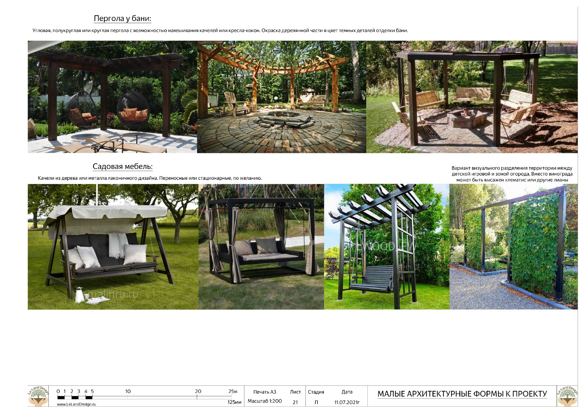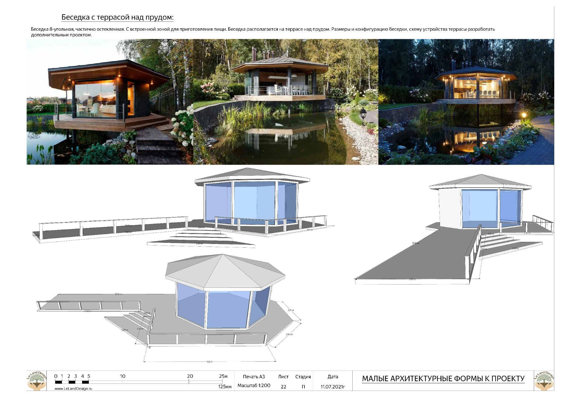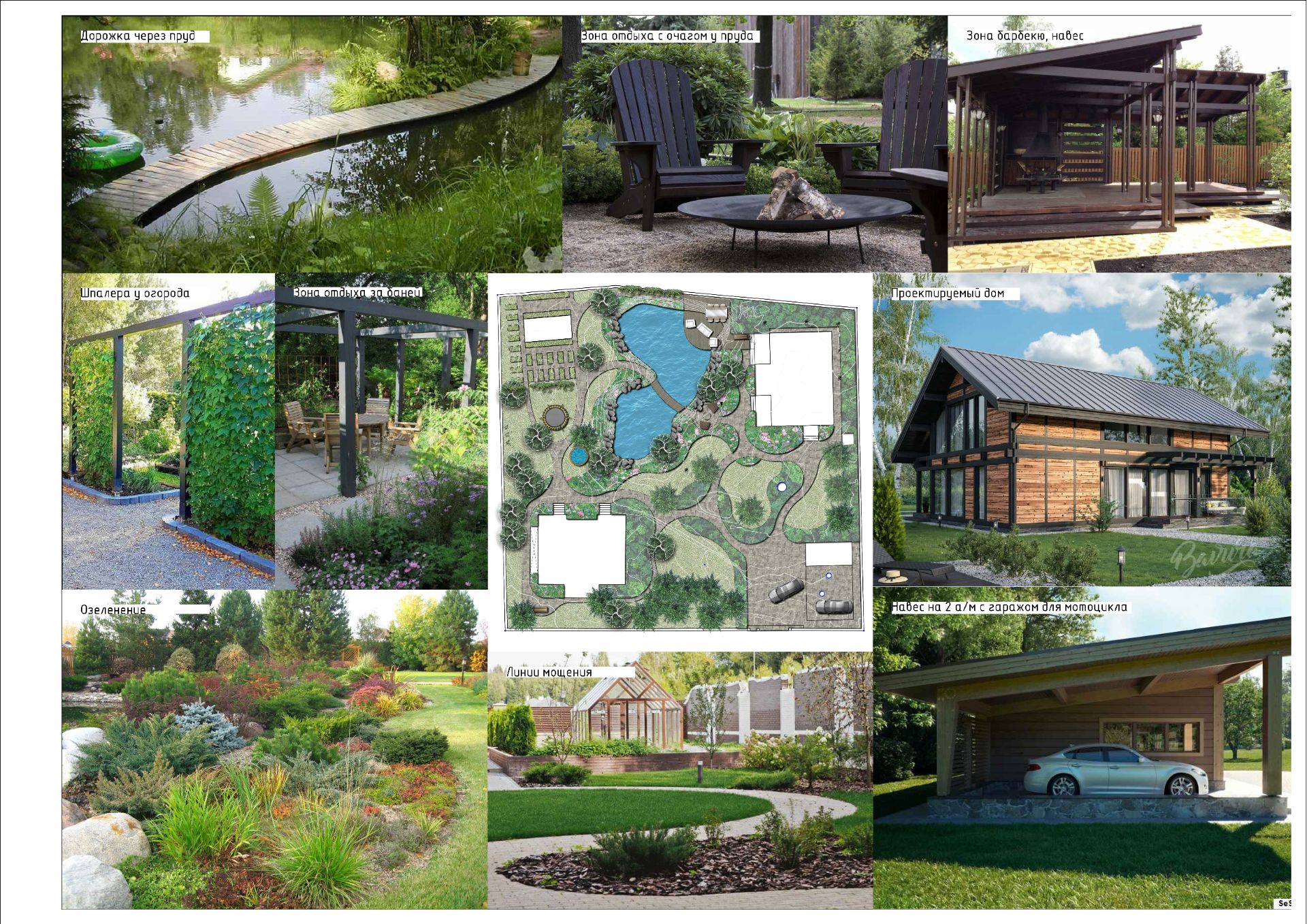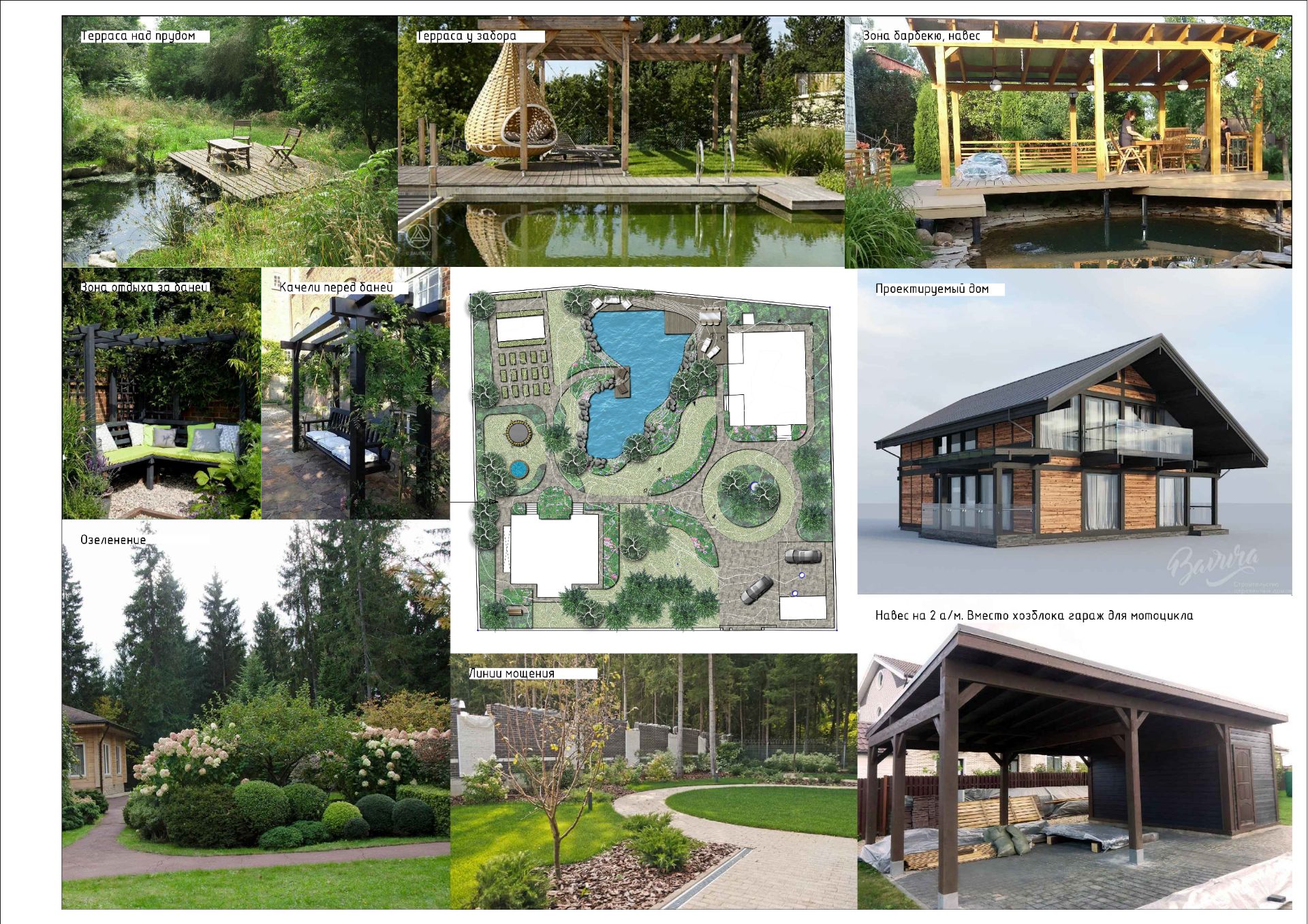 1.2. Разместить вблизи дома летнюю кухню: террасу с навесом, размерами достаточную для установки столовой группы и передвижного барбекю. Возможно устройство террасы над берегом пруда у забора, чтобы перекрыть вид на соседний участок.