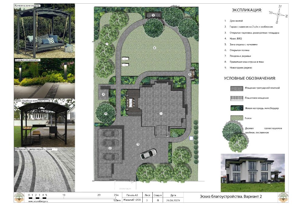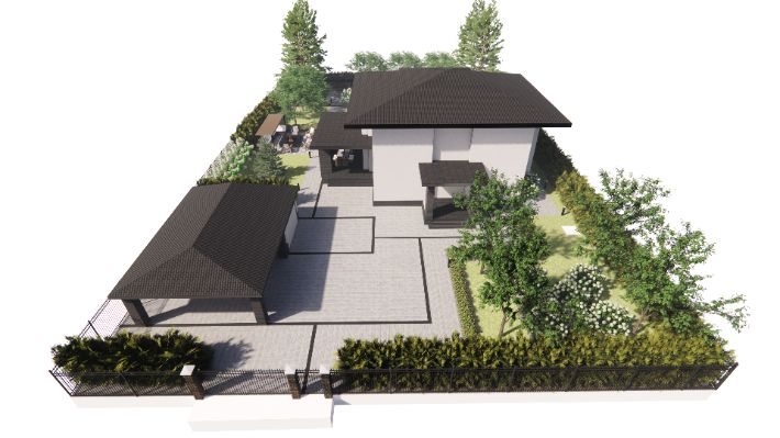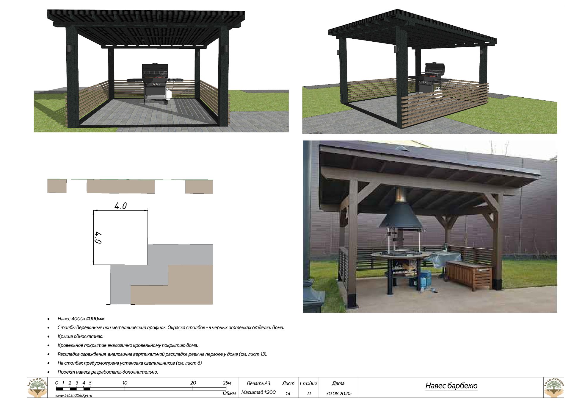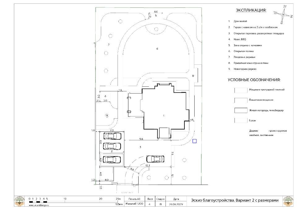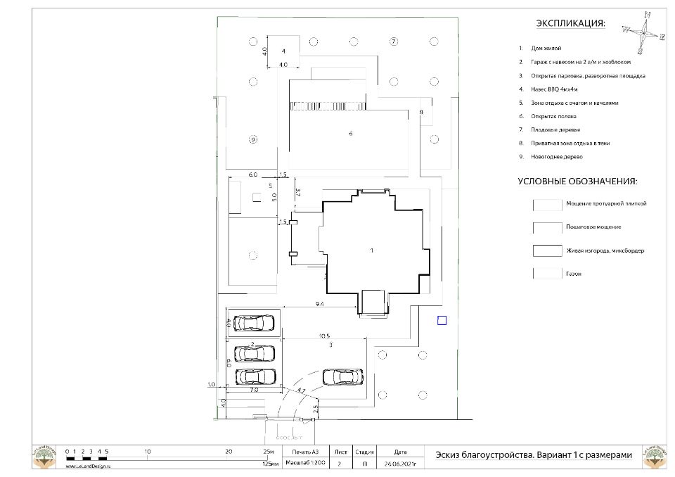 5. Разместить навес или площадку-барбекю в двух вариантах: ближе к дому и дальше от дома, ближе к границе.