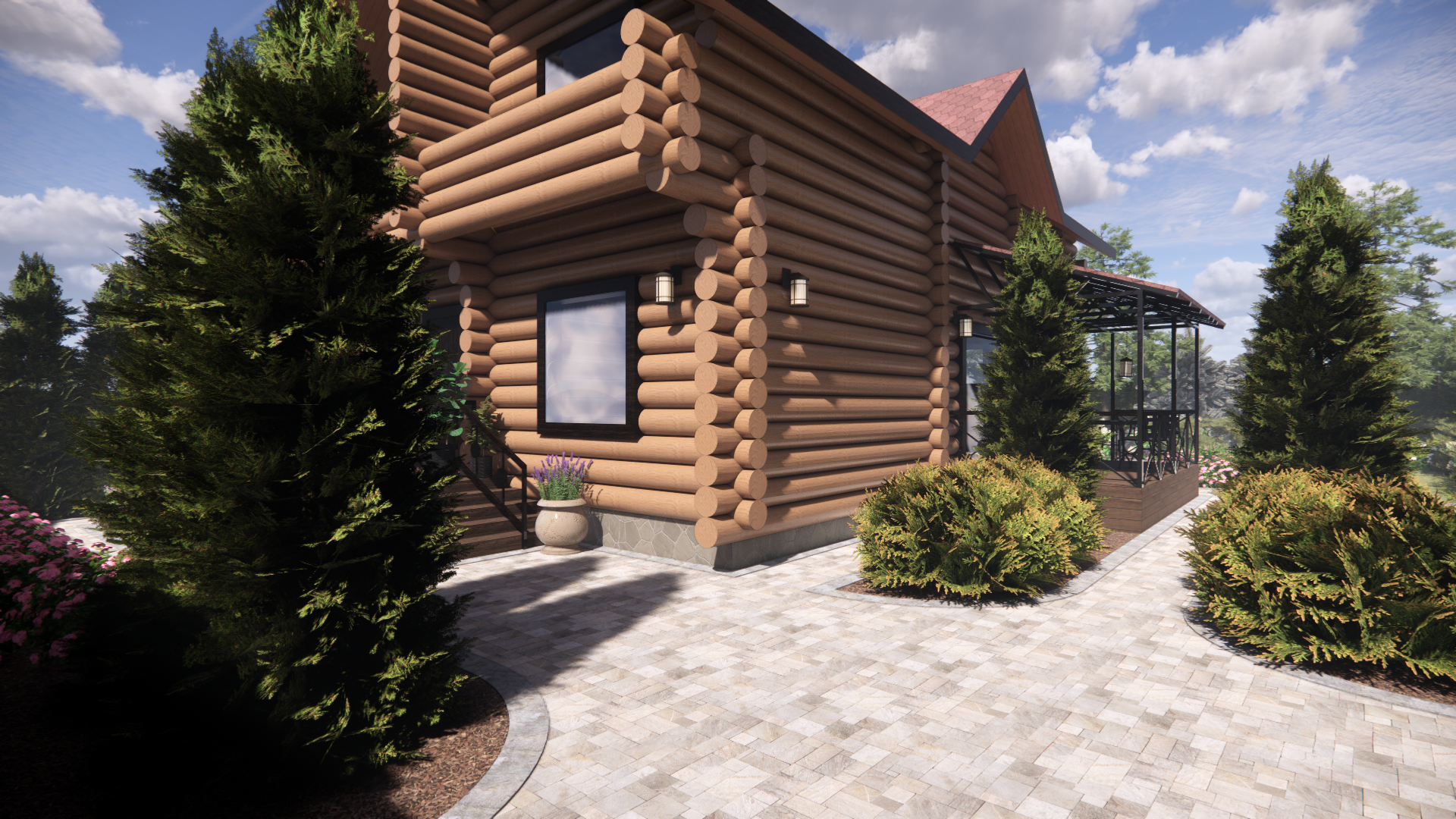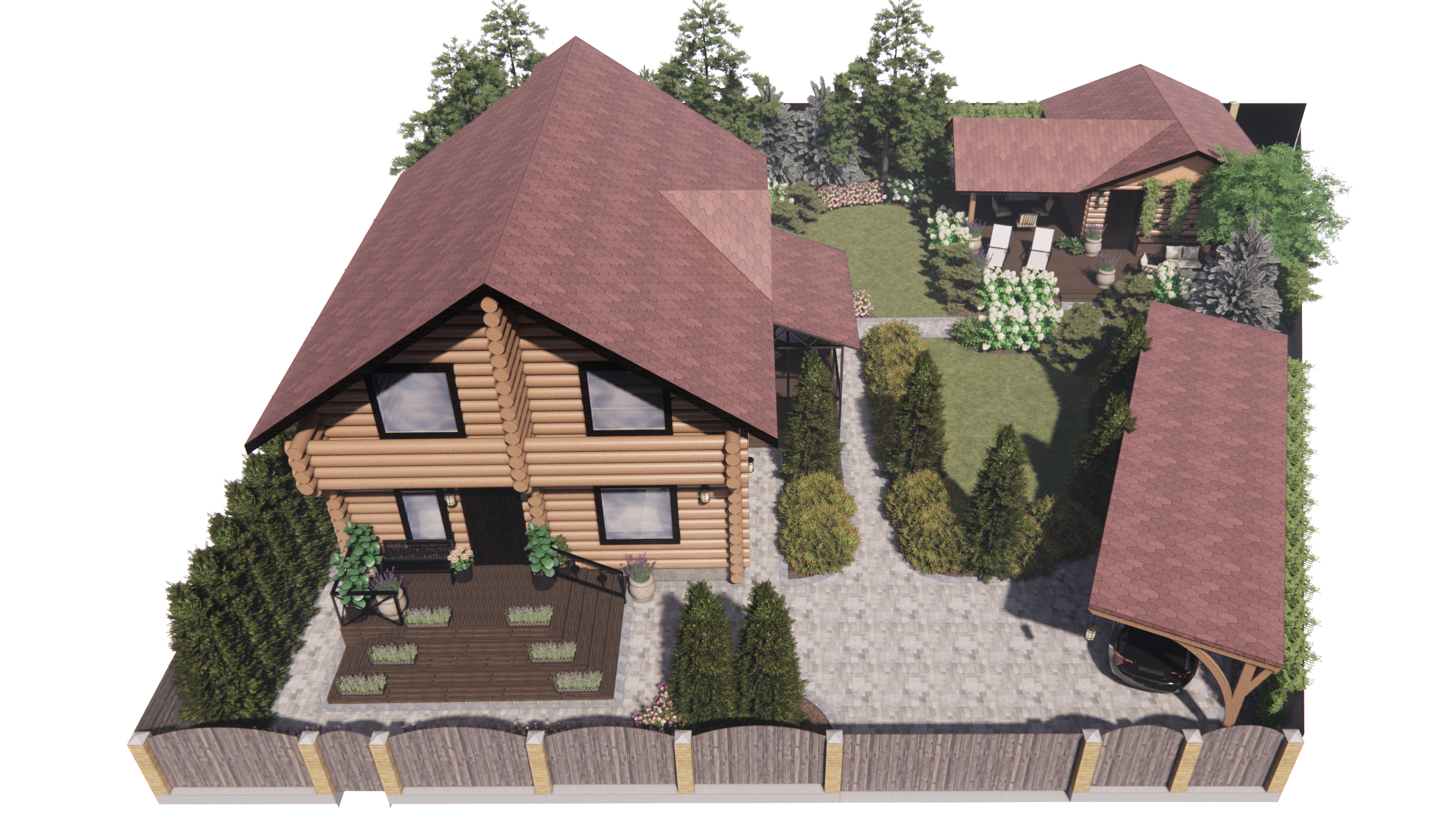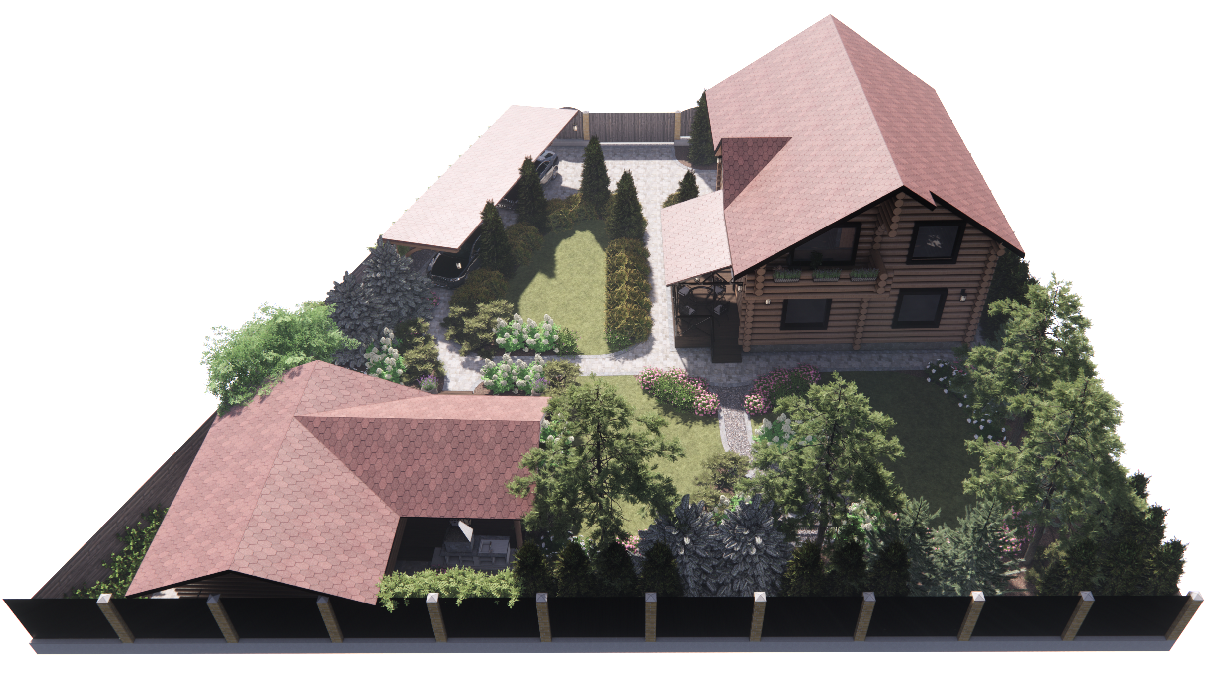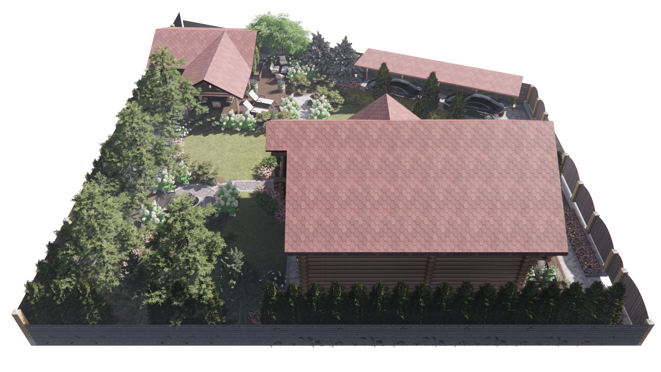 Участок площадью 1000м2.Участок расположен в коттеджном поселке. По периметру забор: внешняя часть-профлист, внутренние границы – деревянный. Дом из бревна. Баня из бревна, фасад зашит доской. Залита бетонная площадка под парковку. Ворота откатные. У дома выполнена бетонная отмостка, установлены дождеприемные колодцы с решеткой. У бани выполнена отмостка из доски, дождеприемные колодцы отсутствуют.
